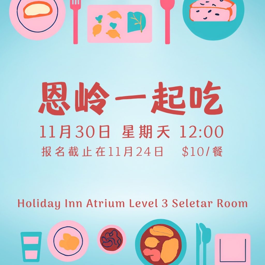 《恩岭一起吃》是我们恩岭欢迎所有在恩岭聚会的弟兄姊妹团聚的一餐。我们通过分享食物的快乐,可以进入到认识彼此的喜乐。请留意的是,我们需要您预先在11月24日前报名,也需要您缴付10块钱。这样,我们的安排可以方便许多。谢谢大家的参与!